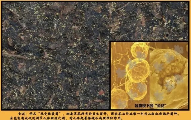 湖南农业大学茶学系教授经过研究证明,“金花”菌是一种抑制作用极强的强势菌种,只要它生长出来,其它杂菌就被抑制了。