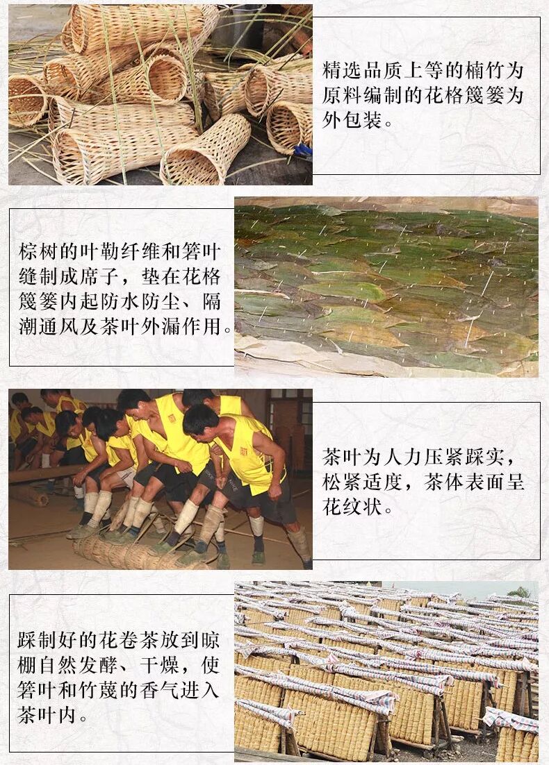 千两茶是一个作品,作品便讲究搭配。正如“人无完人,茶无完茶”,人无完人需要自我修炼学习,茶无完茶便需要搭配。单一茶料难以造出好茶,这更需要制茶师傅具有高超的拼配本领,对其进行科学配伍。在这个领域,李华堂家族代表着原料和拼配的最高水准。