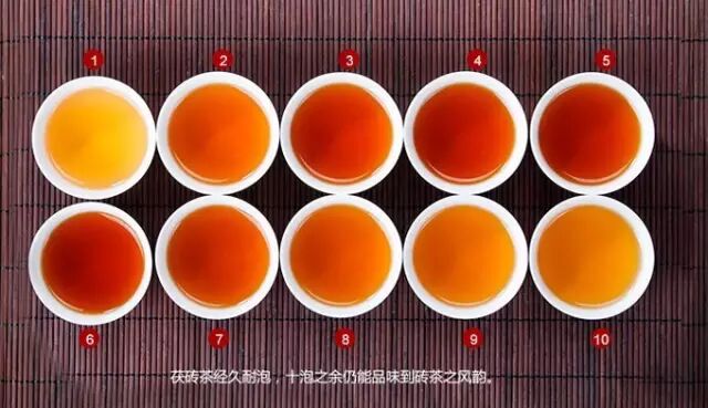 黑茶茶梗易折断,手捏叶可成粉末,黑茶干茶色泽油黑,松烟香气扑鼻时,即为适度。