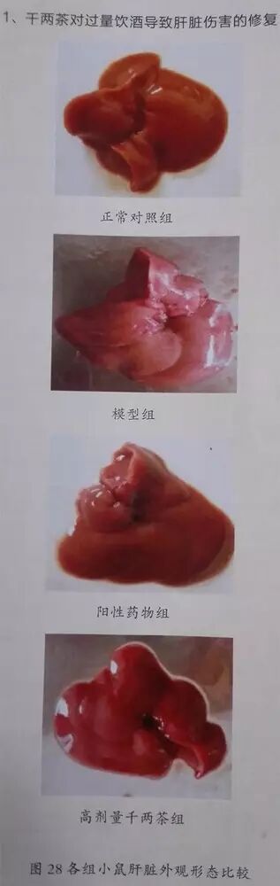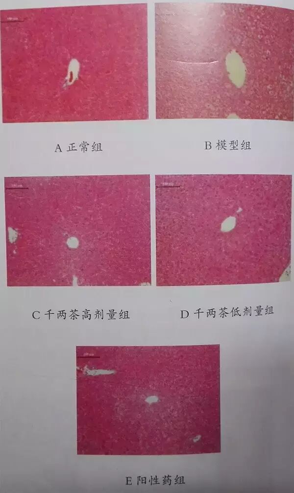 研究过程中发现,模型组小鼠灌胃乙醇后,绝大部分行动迟缓,行走不稳,重者醉倒嗜睡,对外界刺激的反应明显较弱,甚至没有反应,大约1小时左右后逐渐恢复正常,进食量及饮用量明显少于对照且,严重脱毛,皮毛欠光泽。对照组小鼠皮毛光泽柔顺,行动敏捷,对外界环境的刺激反应迅速,进食量及饮水量正常。肝组织解剖时发现,如图所示,对照组小鼠肝脏大小正常,边缘锐利,质地光滑柔软,颜色暗红,切面鲜红。模型组小鼠肝脏外观弥漫性肿大,边缘稍钝,触之中面团,有油腻感,压迫时可出现凹陷。千两茶组和阳性药对照组较模型组减轻,小鼠肝脏颜色明显变红,表面光泽度增高,千两茶高剂量组外观形态与正常组较接近。