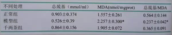 下图的抗氧化指杯测定结果表明,与模型对照组相比,千两茶茶组的总巯基含量明显增加,MDA的含量显著降低。可见,饲喂千两茶茶的小鼠体内抗氧化能力明显增强。