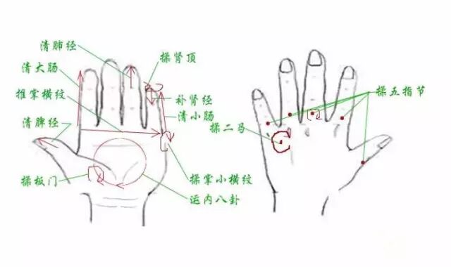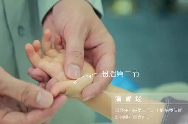 (2)清肺经、清心经、清脾经、推四横纹清热。