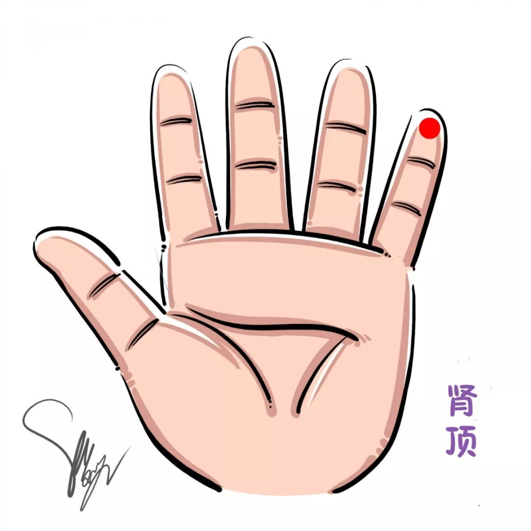 肾顶在小指的指尖,用食指、中指轻轻托住小指,用拇指指腹揉小指的顶端100~500次。