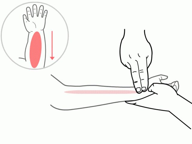 【推拿手法】用一只手握住孩子的手腕,使其掌心向上,然后用中指、食指指腹自孩子腕横纹推向肘横纹,直推300-500次,推的方向一定是从腕到肘,不可反向操作,揉3分钟。