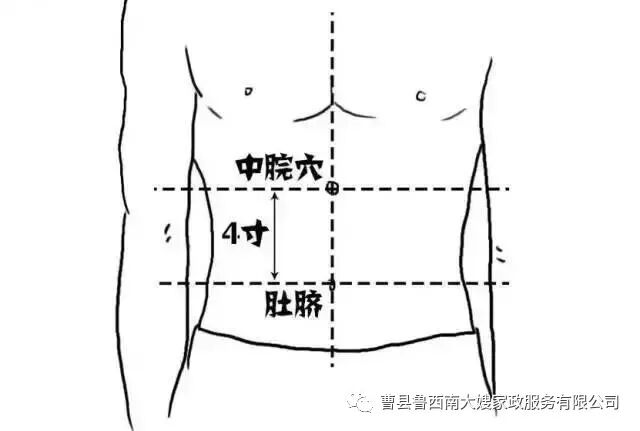【位置】中脘穴位于上腹部,胸骨下端和肚脐连接线中点(当脐中上4寸)。