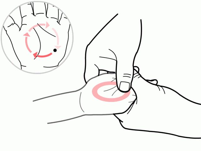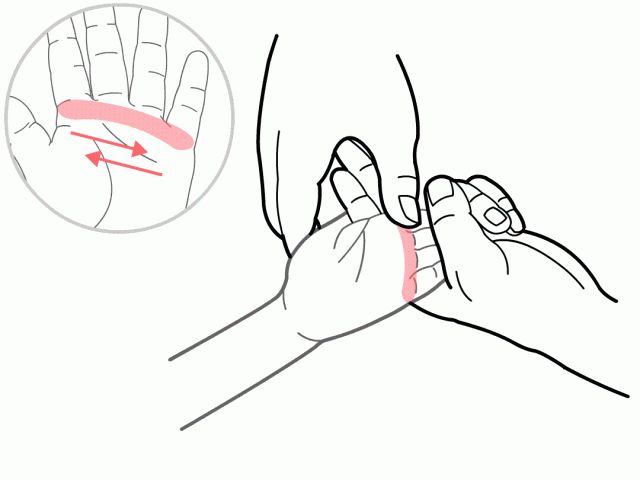 【推拿手法】用一只手固定孩子的手掌,然后用另一只手的拇指指端揉孩子的大鱼际,成为揉板门或运板门,揉5分钟。