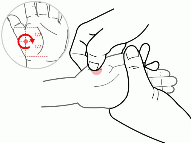 【位置】内八卦位于手掌面,以掌心为圆心,从圆心之中指横纹内2/3和外1/3交界点为半径,作画圈状。