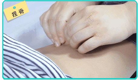 操作方法:操作者双手的大拇指与食指、中指、无名指相对,向上捏起皮肤,同时向上捻动。两手交替,沿脊柱自下向上操作,可操作5~10遍。