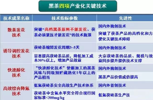 《黑茶提质增效关键技术创新与产业化应用》项目研究黑茶加工品质风味形成的机理,全面丰富了黑茶加工理论体系;构建了以“调控发花技术”、“品质醇化技术”、“散茶发花技术”、“茯砖茶表面发花技术”、“高效综合降氟技术”为核心的黑茶加工新技术体系。