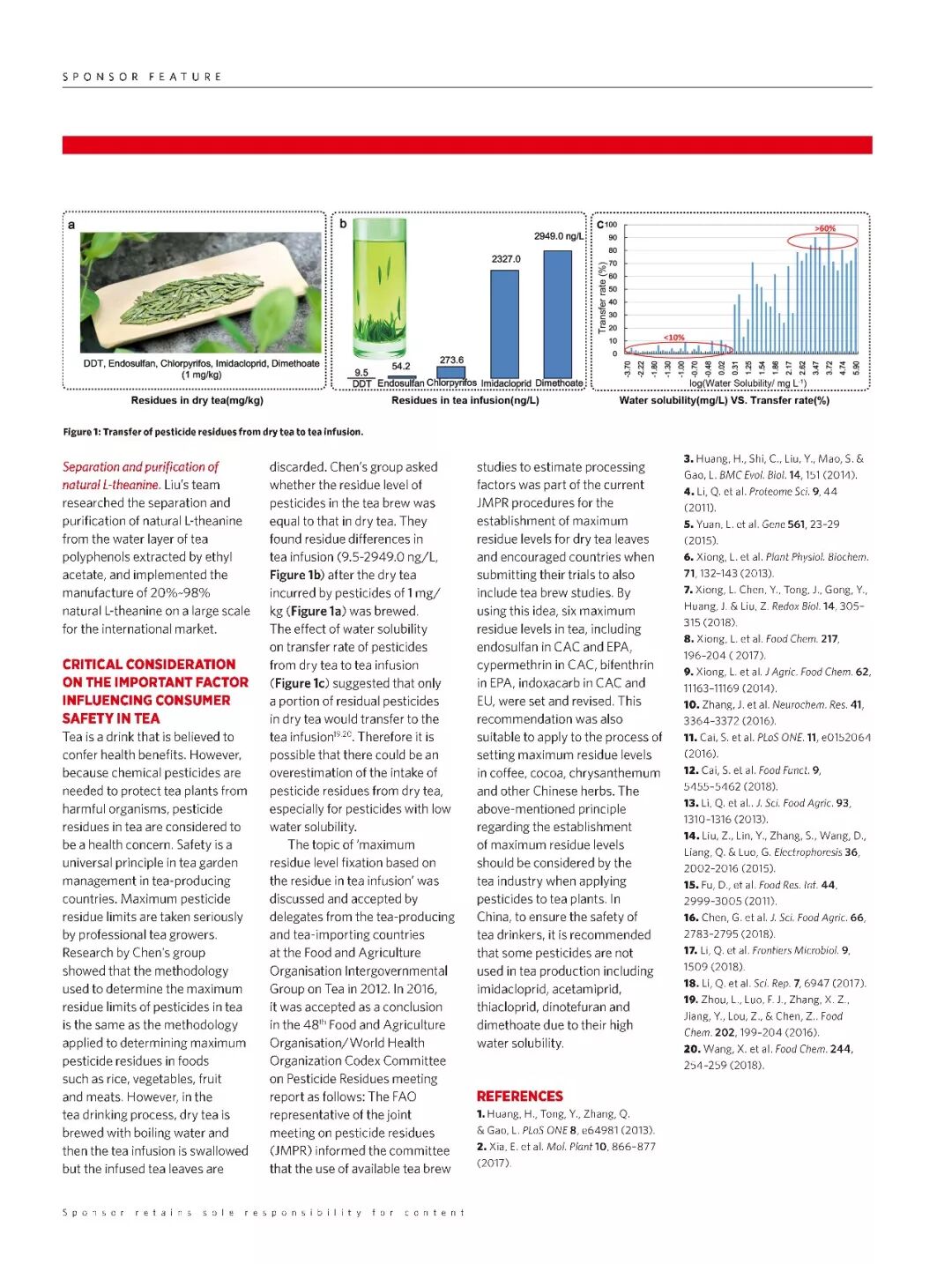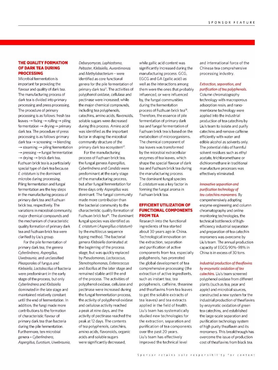 摘录部分内容:中国是世界上最大的茶叶生产国和消费国,拥有丰富的茶树资源和茶产品(包括绿茶,红茶,黑茶,乌龙茶,白茶和黄茶)。进入新世纪以来,科学研究和技术创新促进了中国茶叶产量、质量、安全和消费的提高,推动了中国茶叶产业的健康持续发展。中国农业科学院茶叶研究所院士陈宗懋院士,湖南农业大学刘仲华教授团队和华南农业大学教授高立志教授研究团队在茶树基因组学和资源利用,茶叶加工理论,茶叶和健康,茶叶功能成分利用,茶叶农药残留和安全等研究领域的一系列突出成就。