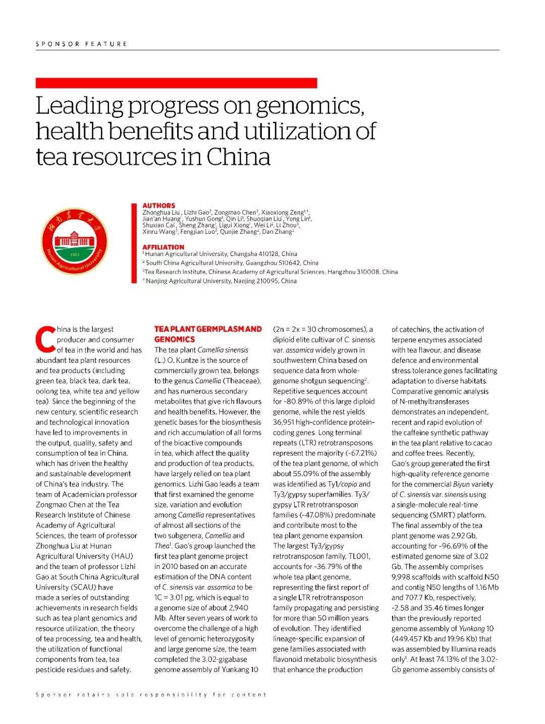 China is the largest producer and consumer of tea in the world and has abundant tea plant resources and tea products (including green tea, black tea, dark tea, oolong tea, white tea and yellow tea). Since the beginning of the new century, scientific research and technological innovation have led to improvements in the output, quality, safety and consumption of tea in China, which has driven the healthy and sustainable development of China’s tea industry. The team of Academician professor Zongmao Chen at the Tea Research Institute of Chinese Academy of Agricultural Sciences, the team of professor Zhonghua Liu at Hunan Agricultural University (HAU) and the team of professor Lizhi Gao at South China Agricultural University (SCAU) have made a series of outstanding achievements in research fields such as tea plant genomics and resource utilization, the theory of tea processing, tea and health, the utilization of functional components from tea, tea pesticide residues and safety.