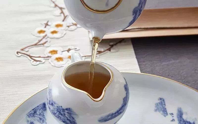 倒茶时公道杯的杯口尽量靠近杯子,以不会溅出茶汤的高度为宜。