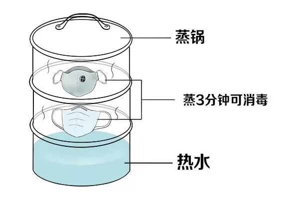 先用锅将水烧开,然后将口罩放在蒸架上,蒸三分钟左右,蒸好的口罩放在干净的容器里晾干。特别要注意一点,晾晒口罩时,千万不要直接将口罩暴露在灰尘严重的环境中。还可以利用75%的医用酒精喷洒口罩两面即可完成消毒,也可直接将口罩放置在阳光下暴晒,利用紫外线杀菌消毒。