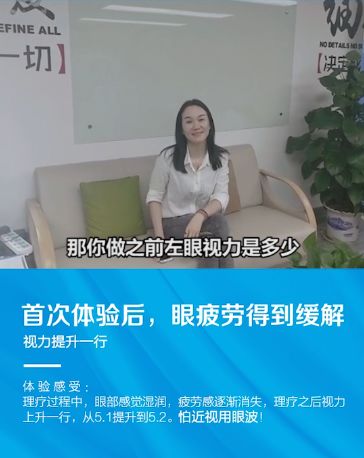 首次体验后,眼疲劳得到缓解,理疗仪过程中,眼部湿润 ,疲劳感消失,理疗之后视力上升一行,从5.1提升至5.2
