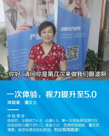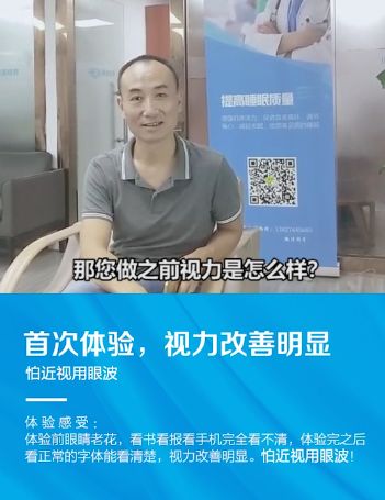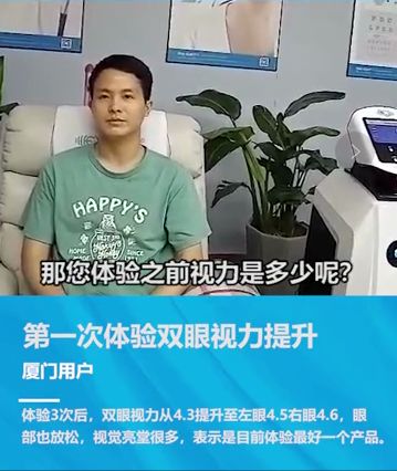 厦门用户:这是一个让我印象深刻的受益者,这位先生因工作需要长期使用电脑,导致近视,经常眼干眼涩,在还没有遇到眼波前尝试很多眼产品,也没用达到意想效果,后经朋友介绍的眼波,抱着试试看的态度体验我们眼波三次后,双眼视力4.3提升至4.6,眼部也放松,视界亮堂很多,表示是目前体验做好一个产品。