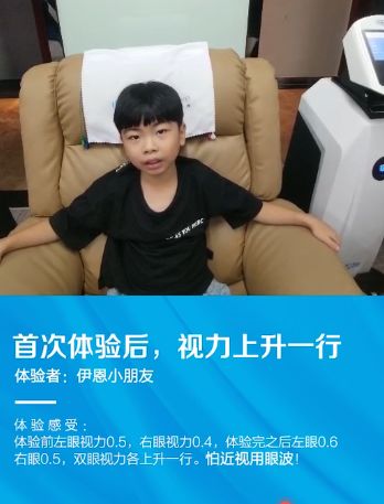 伊恩小朋友首次来体验眼波,体验前左眼视力0.5 右眼视力0.4,体验后左眼0.6,右眼0.5,双眼视力各上升一行。