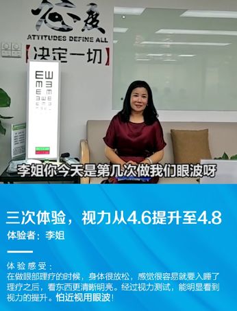 李姐体验眼波三次视力从4.6提升至4.8,在理疗过程中很容易进入睡眠,理疗之后看东西清晰明亮,视力明显上升。