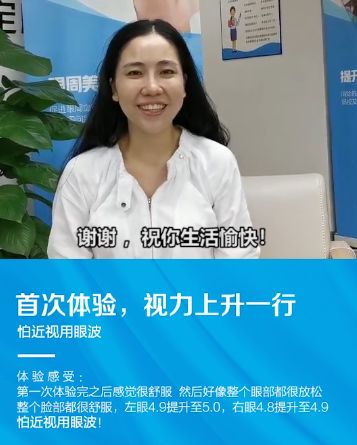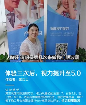 应姐体验眼波理疗仪三次后,视力从最初左眼4.7,右眼4.8.体验后双眼视力提升至5.0,做完后眼睛感觉轻松舒适,赞不绝口并会把眼波理疗仪分享给身边好友。