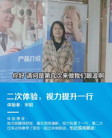 宋姐体验眼波两次,视力提升至一行,做完眼睛很舒服,看东西很清晰,第二次来还特意带了朋友过来做眼波