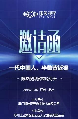 2019年12月7日苏州中心广场WeWork,眼波视界携手苏州工业园区爱心达人公益慈善基金会,召开“一代中国人半数届近视,全民护眼刻不容缓”眼波视界招商说明会,会议主题围绕眼波视界商业模式进行交流,眼波视界优秀区域代表分享案例,解读共享经济新趋势。点击下方“阅读原文”,了解更多会议信息。