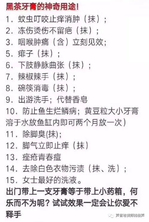 黑茶牙膏可作预防牙病用途,应在无牙病时就使用,否则失效,因为,牙坏了不可能再重新长出来。 华莱黑茶牙膏从试验到成功,经历了科研工作者长久的艰辛劳动,普查试验了几千人。过去牙虫是无人管,牙科医生只管治牙齿,不管牙病是怎么来寄生虫的病,医生只管除肚子的虫,不管除牙虫。 但是华莱研制黑茶牙膏,将问题统一了,对口腔保健起特殊作用,这是黑茶牙膏最具特色的地方。此外,普通牙膏具有的清洁,清新口味,除口臭等功效,华莱这一款黑茶牙膏也都涵盖了。