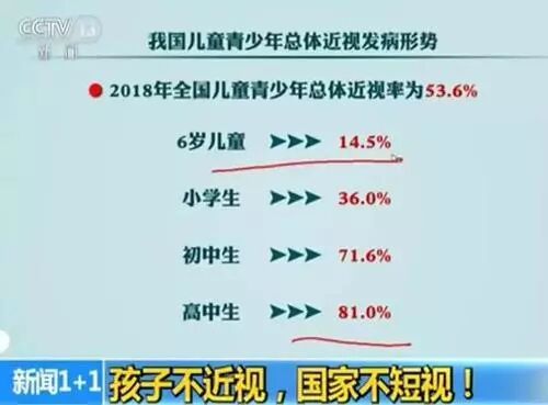 国家卫生健康委疾控局副局长介绍,2018年全国儿童青少年总体近视率为53.6%。6岁儿童为14.5%;小学生为36.0%;初中生为71.6%;高中生为81.0%;近视防控任务艰巨。