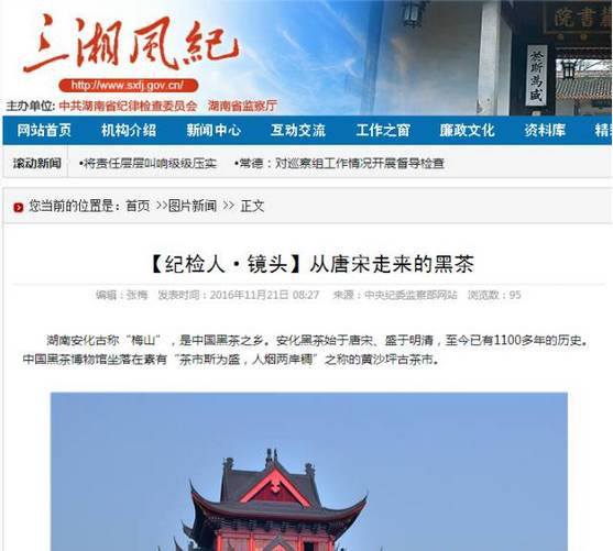 2016.11月20-21日,中央纪委监察网站、三湘风纪纪检人·镜头栏目刊发了“从唐宋走来的黑茶”,以中国黑茶博物馆为主题报道了安化黑茶,下图为证。