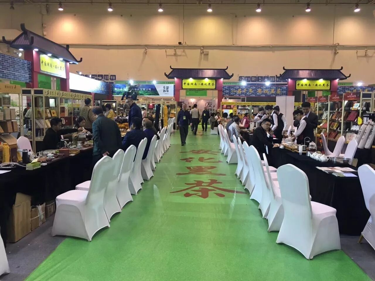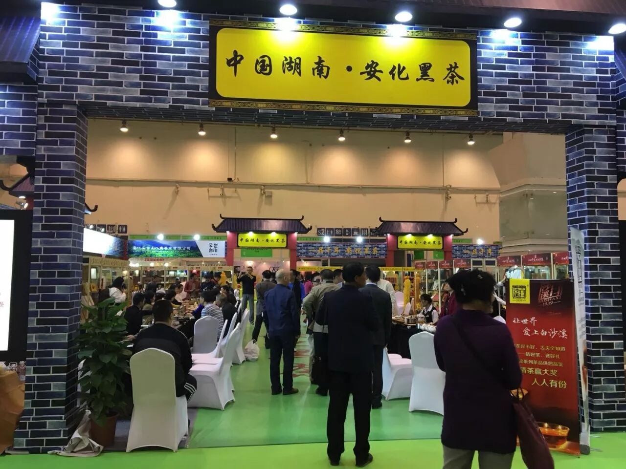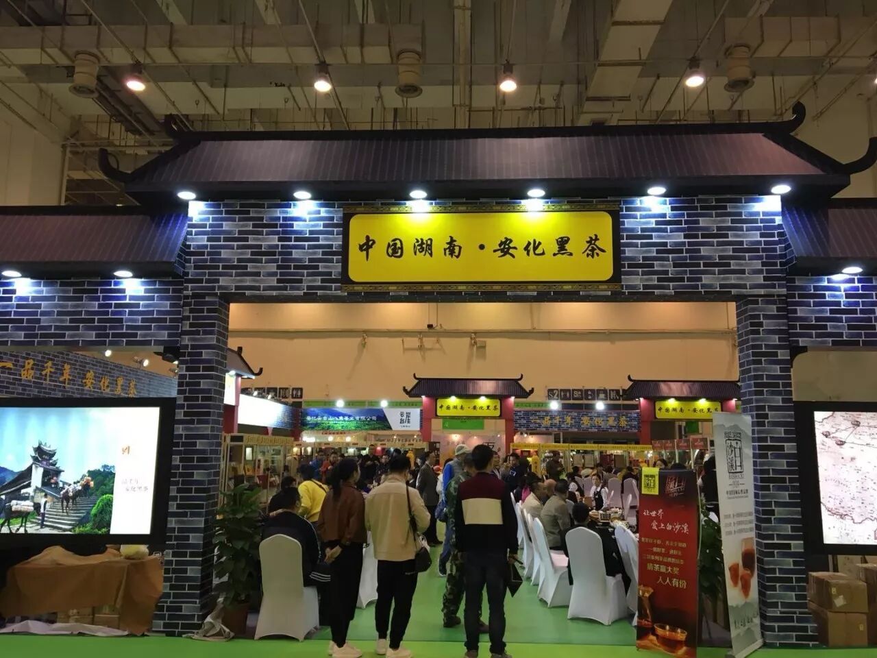 这里就是咱们安化黑茶的展馆了,大家看一下整个展馆的特色,就是以安化传统的民居建筑风格来设计的,里面的布置,每个企业的展台风格都是统一的。展会第一天上午,展区内就是人气火爆,可以说是座无虚席。