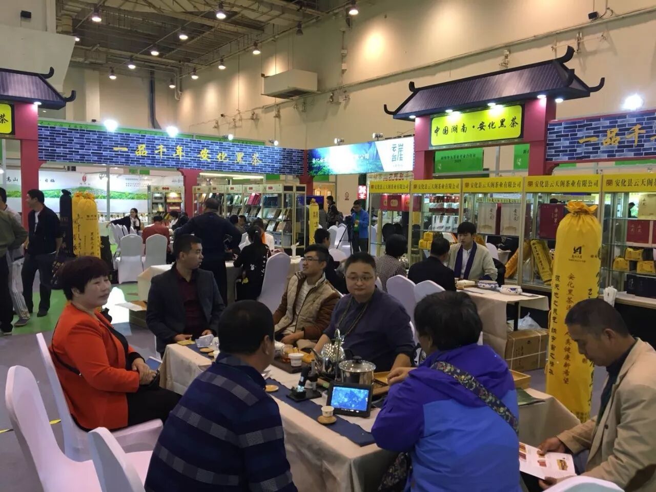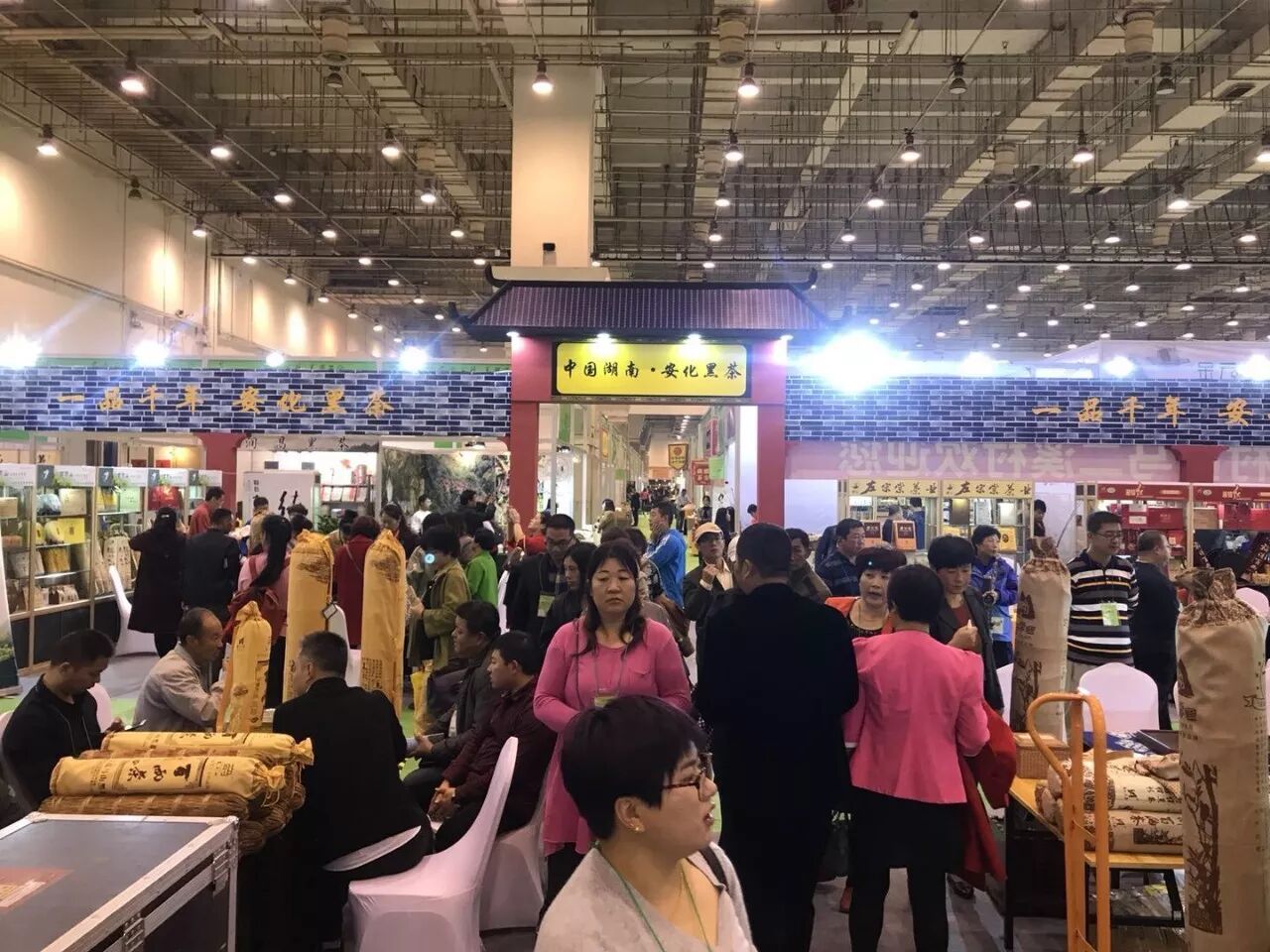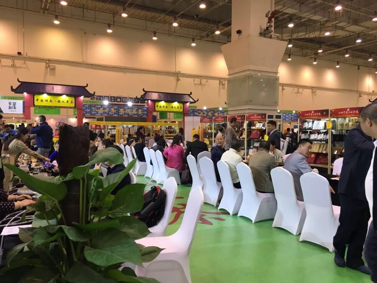 这里就是咱们安化黑茶的展馆了,大家看一下整个展馆的特色,就是以安化传统的民居建筑风格来设计的,里面的布置,每个企业的展台风格都是统一的。展会第一天上午,展区内就是人气火爆,可以说是座无虚席。