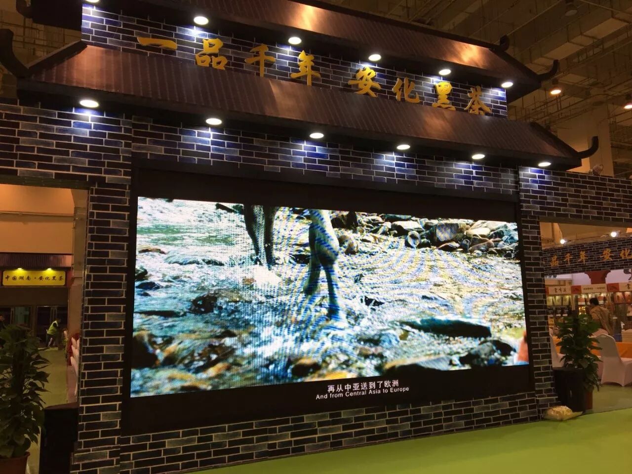 一进入展馆,两个以千两茶外形作为模型的大柱子格外吸引人的目光,上面写着:一品千年,安化黑茶,世界茶王。指引着观众参观的方向,让我们跟随世界茶王的脚步一起去安化黑茶展区看一下吧。