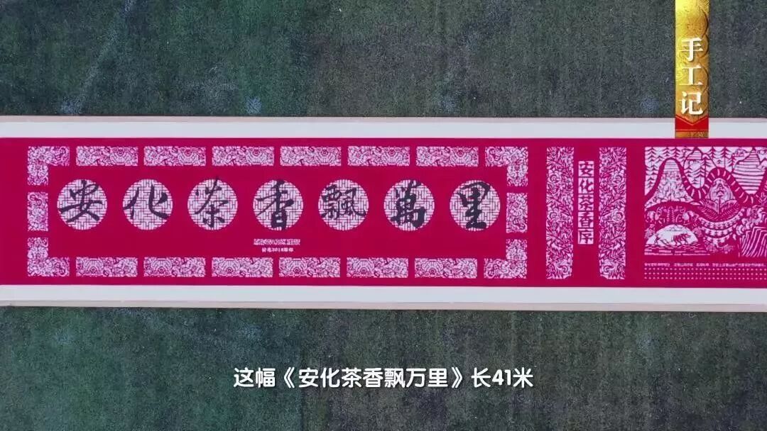 她的剪纸作品《安化茶香飘万里》长41米,由30幅1米多高的剪纸图案拼接而成,从构思到制作完成耗费了有十年的时间。