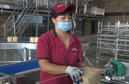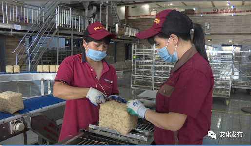 在湖南华莱生物科技有限公司第一生产车间,十几名工人正在制作黑茶,贫困户廖小艳是其中一名包装工人,2014年,因为没有稳定收入,负担不起患有多种慢性病的婆婆的高昂医药费,她家被纳为建档立卡贫困户,2016年,廖小艳和丈夫进入湖南华莱生物科技有限公司有了稳定收入后,一家人顺利脱贫。