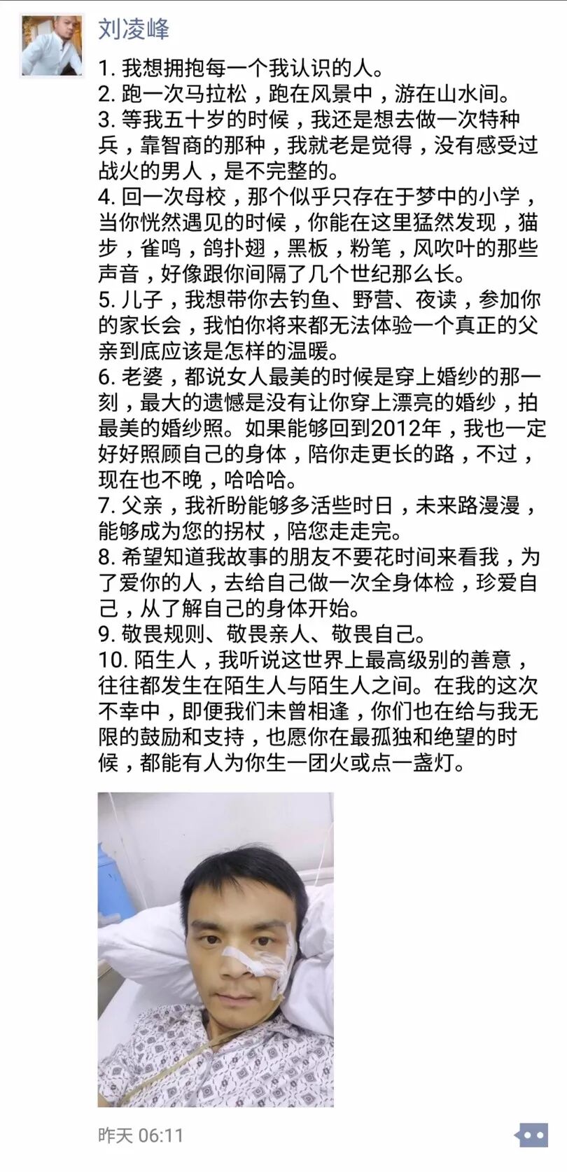 第二天,刘凌峰又发了一条长文章《万一你也得了我这么不好的病,请跟我一起微笑一个,好么?》。他说,乐观是生命中最原始的力量。