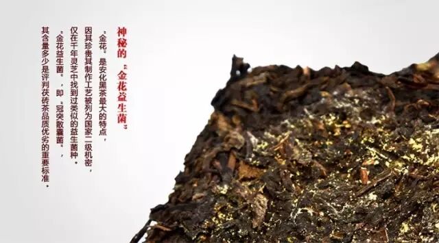 百度百科:冠突散囊菌,也叫金花,微生物学家发现,只有湖南的安化黑茶里面才有金花----这个地球上新发现不到30年的微生物。过去只在千年灵芝上才偶尔发现过,尤其在湖南安化的黑茶中的茯砖茶中生长及其茂密,这是湖南安化黑茶所独有的益生菌种,也叫霸王菌,这种菌能有效的抑制肠癌,胃癌,肝癌细胞的扩散。在高倍放大镜下,‘金花’呈金黄色,形状如球形蘑菇,大量的研究和临床数据表明,冠突散囊菌的功效与千年灵芝孢子粉非常的类同,能够有效的提升人体免疫能力,防癌,抗癌,抗氧化,抗衰老,令人延年益寿,此外,消脂减肥的功效远远超越其他任何的菌种,所以安化黑茶车成为了世界各科研机构的研究热点。