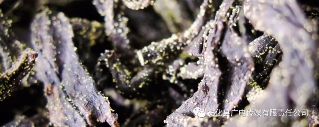 这种金黄色的颗粒,俗称“金花”,学名“冠突散囊菌”,是茯茶在特定温湿度条件下,通过“发花”工艺长成的自然益生菌体。在国家标准中,茯砖茶是唯一要求“冠突散囊菌”这项指标的黑茶类品种。经研究,“金花”对后发酵茶品质不但没有影响,反而“金花”能分泌茶叶中的淀粉酶和氧化酶,可催化茶叶中的淀粉转化为单糖,催化多酚类化合物质氧化,使茶叶汤色变棕红,消除粗青味。在口味上更加醇和爽口,甜滑回甘。它具有较强的促消化、降血脂、溶解脂肪、调节糖类代谢等功效。其颗粒的大小会随着湿度等因素变化而发生变化,茂盛的时候似“米兰”,萎缩时会变小,甚至变成白色的小斑点,但不影响其品质和功效。