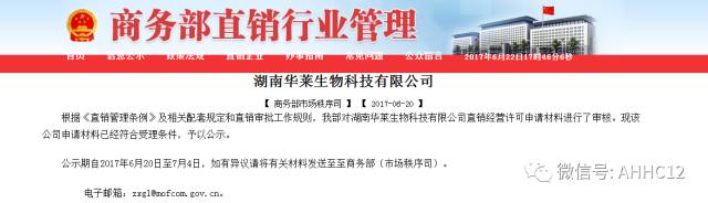 2017-06-20 商务部对湖南黑茶公司直销经营许申请材料已经符合受理条件,予以公示。