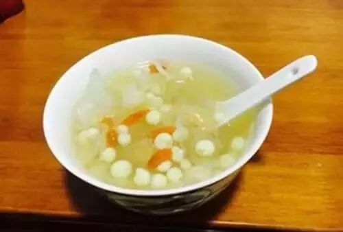 食材:芡实250克、银耳一小朵、莲子少量、枸杞少量、冰糖少量
