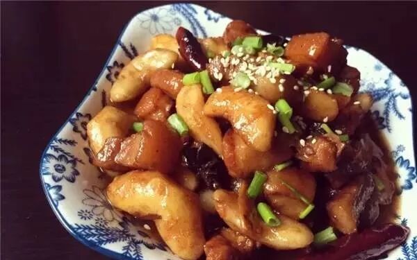 3、炒锅放油将菱角过一下油,再加入适量水煮至菱角熟,再加入炒好的香菇,葱粒和猪肉,沙茶酱炒匀即可