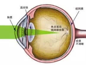 近视眼(myopia),从无限远处来的平行光,经过眼的屈光系统之后,在视网膜之前集合成焦点,在视网膜上则结成不清楚的像。