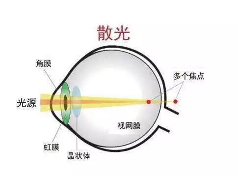散光(astigmatism),眼球在不同子午线上屈光力不同,进入眼球的光线不能在视网膜上形成焦点。