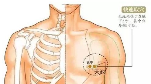 天池穴是心包经的第一个穴位,位于乳头外上方一寸,第四五肋间。