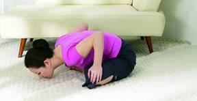 2、重心落在骨盆,意识力集中在腰部,吸气,用腰力带动上半身,直到背部平行于地面,腰弯到你的极限,注意背部要平不要驼背。