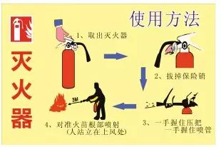 (4)学会使用灭火器,"一提二拔三对准四喷",注意区分干粉和干冰灭火器,当你的同事或者家人身上着火的时候,只能使用干粉灭火器对他们的身体进行喷射,否则干冰灭火器喷出的零下 70度的干冰,会让他们着火的身体的肌肉发生爆炸。