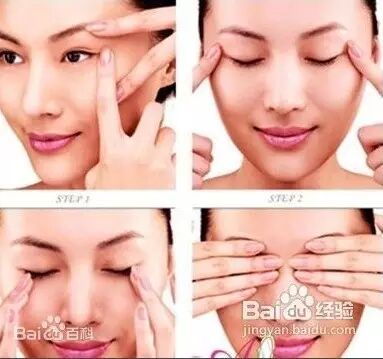淡化眼角皱纹(1分钟):食指和中指按在双眼两侧,慢慢推揉眼侧皮肤,同时闭眼。当眼皮垂下时,手指缓缓地朝耳朵方向拉,从1数到5,然后松手。重复做6遍。