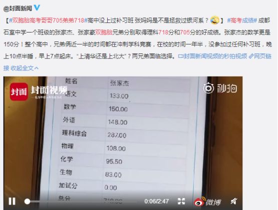哥哥考分高达705分,弟弟718分,成为万千家长羡慕的对象。