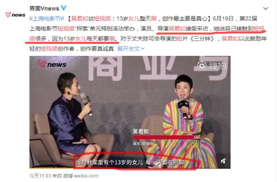 就连香港知名女演员吴君如6月19号参加上海电影节的时候都宣称,自己接触短视频很多,而她13岁女儿则是每天都要刷。