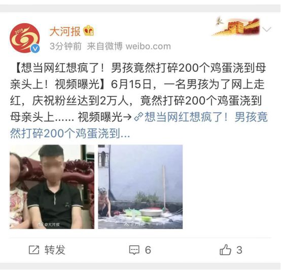 6月15日,一名男孩为了走红,打碎了 200 个鸡蛋从二楼的阳台上倾盆而下,倒在母亲的头顶。