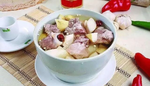 原料:川贝母9克,雪梨2个、猪肺120克做法:猪肺洗净切片,水中煮5分钟,再用冷水洗净。川贝母洗净,雪梨连皮洗净,去梨心连皮切小块。将3种全部放入锅中,沸水煮开、小火再煮2小时,以个人口味调制后饮用即可。此汤可清肺、止咳、化痰、润肺、清除肺部污气的作用。肺部不好时,可用此营养药膳。