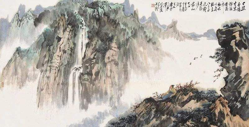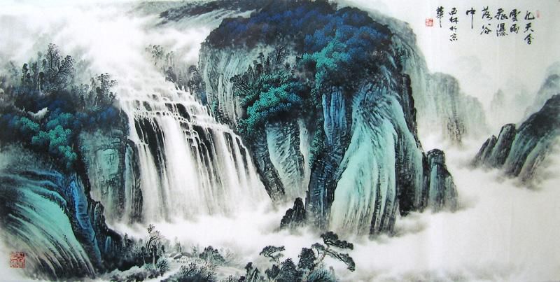 第二句“遥看瀑布挂前川。”远远望去,一条瀑布挂在前面的水面上。一个“挂”字,用的极好,用之,则这里的瀑布,就像一条真正的布匹一样,挂在悬崖上,表现出了一种极为壮丽的自然景色。