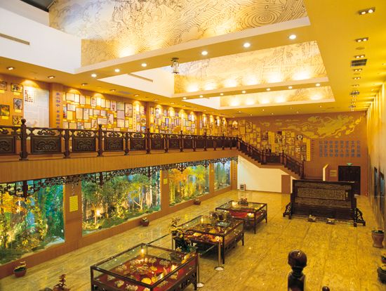 该馆面积达800多平方米,其设计采用了中国南方建筑装饰风格,楼沿台阶扶手等用料考究,突出了以姿态多样的灵芝图形雕饰。该馆还考虑到馆内外场景结合。